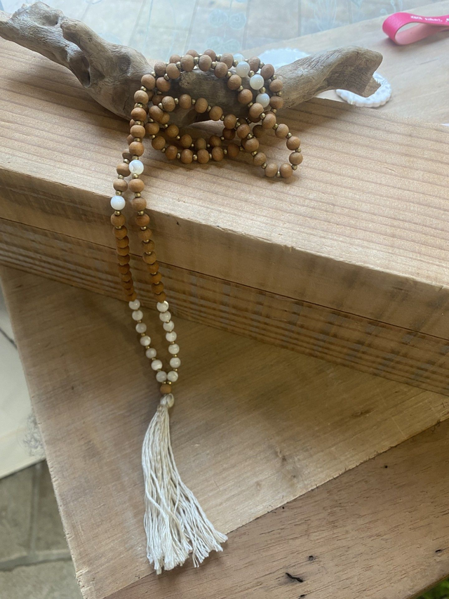 Cette merveille intemporelle est constitué de 108 perles. Ses origines se nichent dans les enseignements anciens de l'hindouisme, du bouddhisme, de la méditation et du yoga. C'est un compagnon de méditation, un talisman de bonheur et un symbole de style, destiné à vous accompagner vers le bien-être et la sérénité.