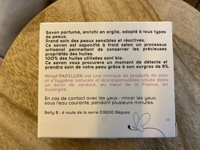 - Un savon à l’argile rose Minut’Papillon : biologique, doux et minéral, il nettoie avec délicatesse le visage ou le corps, laissant un toucher velouté, comme une caresse de pétale.