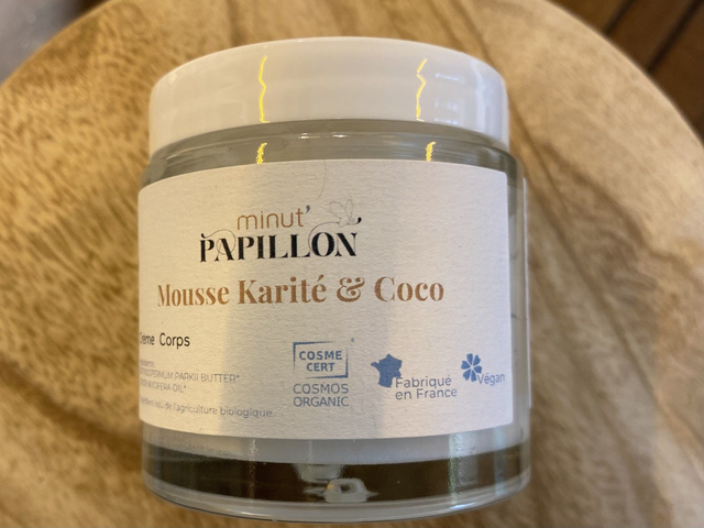 - Une mousse karité & coco Minut’Papillon: biologique, nourrissant et apaisant, elle enveloppe la peau d’un parfum discret et d’un confort immédiat (ingrédients: butyrosespermum Parkii butter, cocos nucifera oil).