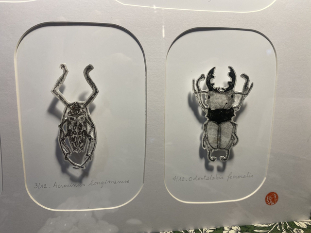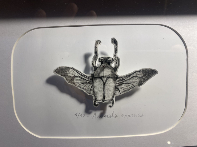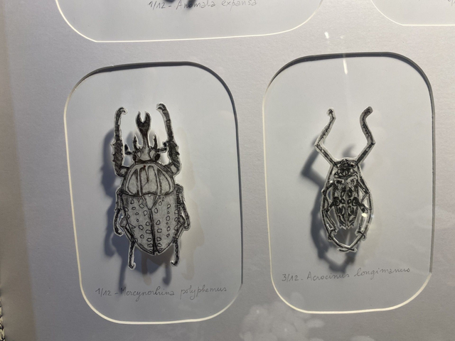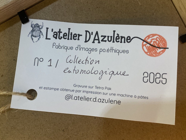 Une composition à partir d'un série de cinq gravures sur tétra pak, où l’art rencontre la science. Chaque insecte, imprimé à l’encre charbonnel sur une machine à pâtes, est piqué en relief avec une aiguille. Cette œuvre rend hommage aux cabinets de curiosités et aux collections d’insectes montés. Un dialogue entre recyclage, art et nature, encadré dans un format profond façon boîte à insectes pour souligner la dimension muséale de l'œuvre.